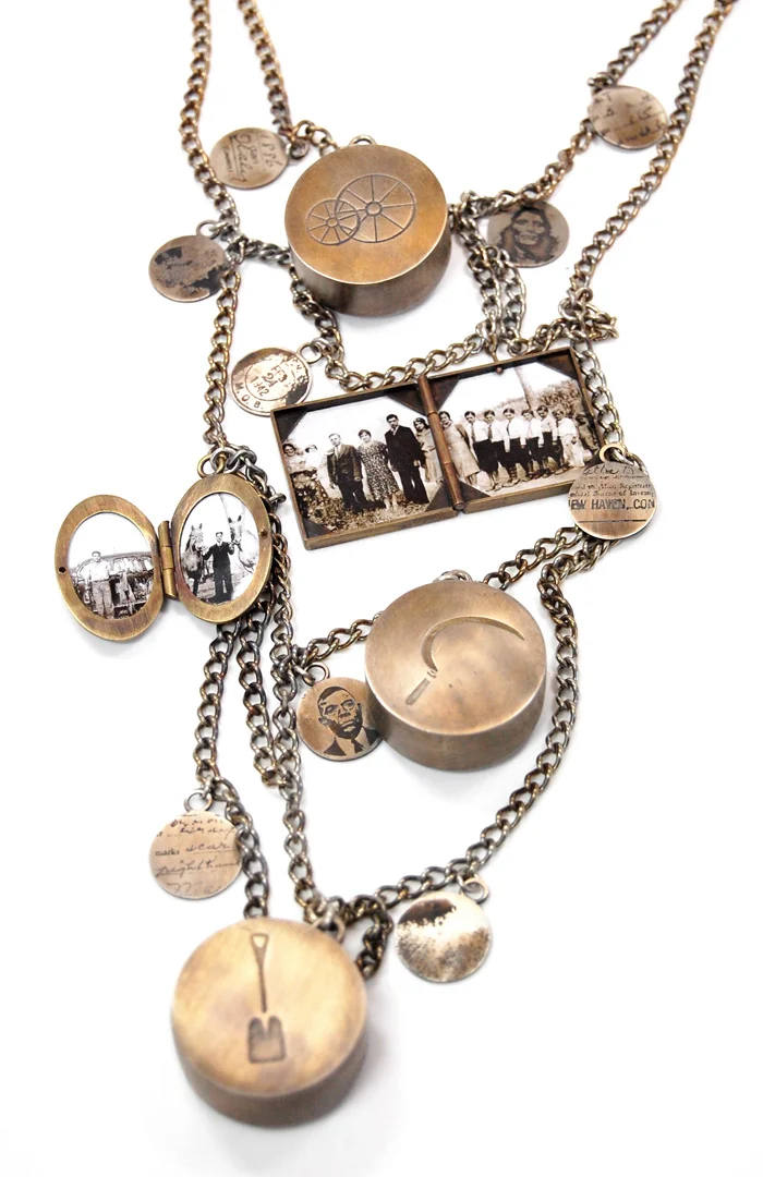 Dear Mom, brass, sterling silver, wood, photos of my mother, spray paint, 4" x 2¾" x ¼", 2017