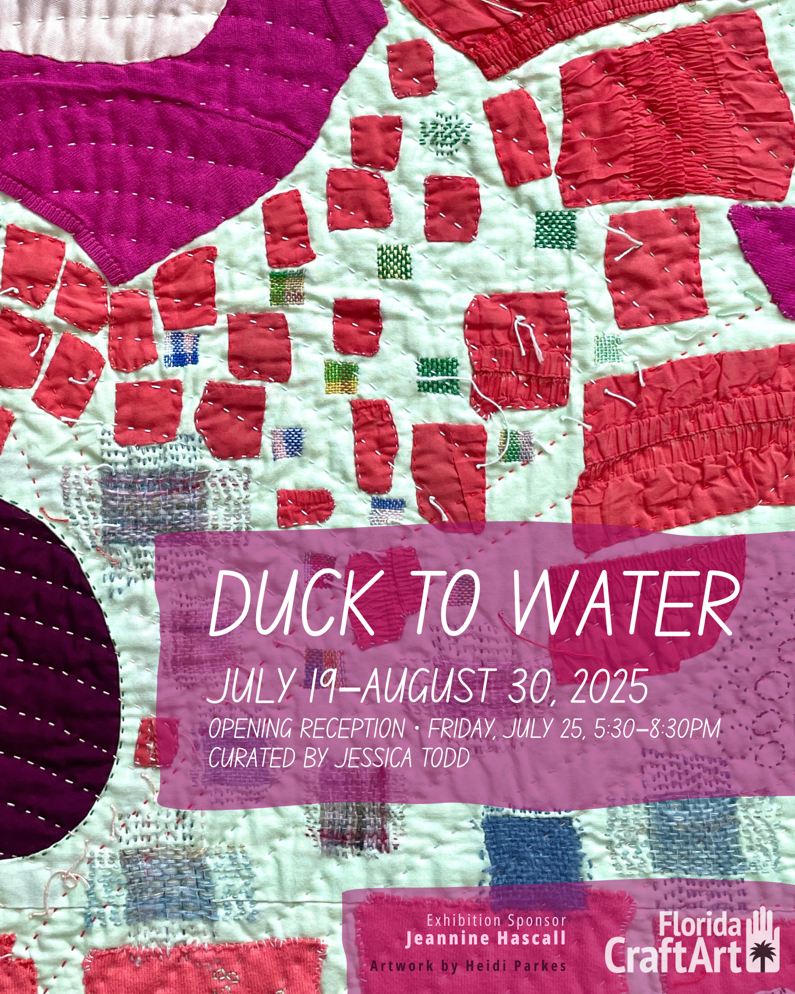 Overview: Duck to Water is an exhibition of top regional and national craft artists who reinvigorate traditional processes to produce cutting-edge contemporary art. Their works in clay, collage, fiber, jewelry, and wood demonstrate skilled application of materials with an intuitive hand. Like ducks to water, they achieve an effortlessness in their work that can only result from mastery of their respective media. The result is an exhibition that buzzes with alluring tactility and a playful spirit.